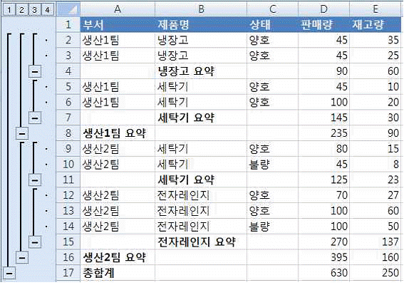 부분합으로 설정된 그룹의 윤곽이 자동 윤곽으로 재설정 되었다.