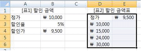 아래 시트에서 [표1]의 할인율[B3]을 적용한 할인가 [B4]를 이용하여 [표2]의 각 정가에 해당하는 할인가 [E3:E6]를 계산하고자 한다. 다음 중 이때 가장 적합한 데이터 도구는?