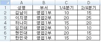 다음 중 아래의 시트에서 수식 =DSUM(A1:D7, 4, B1:B2)을 실행했을 때의 결과 값으로 옳은 것은?