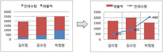 아래의 왼쪽 차트를 수정하여 오른쪽 차트로 변환하였다. 다음 중 변환된 항목에 대한 설명으로 옳은 것은?