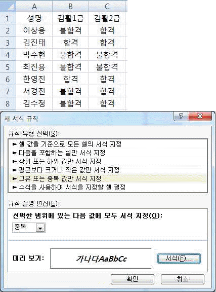 다음 중 아래 시트의 [A1:C8] 영역에서 아래 그림과 같이 조건부 서식을 적용한 경우 서식이 적용되는 셀의 개수로 옳은 것은?