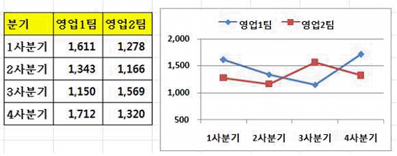 다음 중 아래 워크시트의 표와 표의 데이터를 이용한 차트에 대한 설명으로 옳지 않은 것은?