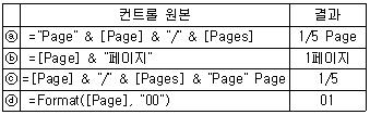 다음 중 보고서 페이지 번호를 표시하는 컨트롤에 입력된 컨트롤 원본과 그 결과가 맞게 연결된 것을 모두 고른것은? (단, 전체 페이지는 5페이지임, 순서대로 컨트롤 원본, 결과)