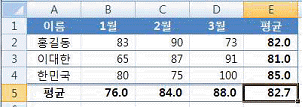 아래의 워크시트에서 전체 평균 셀[E5]의 값이 85가 되도록 ‘이대한’의 1월 값 [B3]셀을 변경하고자 한다. 다음 중 [목표값 찾기] 기능 실행을 위한 수식 셀, 찾는 값, 값을 바꿀 셀의 지정이 순서대로 옳게 나열된 것은?