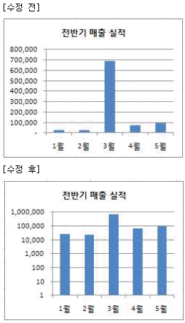 차트에 표시할 데이터 계열의 요소 간 값의 차이가 큰 경우 [수정 전] 차트와 같이 그 차이를 차트에 표시하기가 어려운데, [수정 후] 차트처럼 변경하면 값의 차이를 표시 할 수 있게 된다. 다음 중 [수정 전] 차트를 [수정 후]와 같이 변경하기 위한 축 옵션으로 옳은 것은?