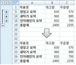 다음 중 아래 그림과 같이 [A1:C19] 영역을 복사하여 부분합의 요약된 결과만 [A23:C27] 영역에 붙여넣기 위한 방법으로 옳은 것은?