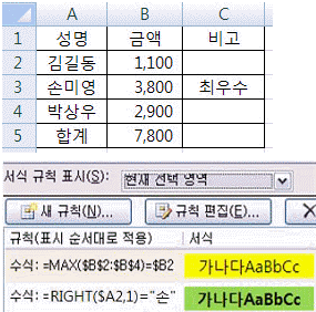 [B3] 셀만 조건부 서식의 첫번째 규칙에 설정된 서식으로 바뀐다.