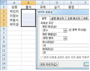 다음 중 아래 그림과 같이 [B2:B5] 영역에 데이터 유효성 검사가 설정되어 있을 때 [B2:B5] 영역에 입력할 수 없는 값은?