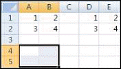 다음 중 아래 시트에서 [A4:B5] 영역을 선택한 후 수식 =A1:B2+D1:E2 를 입력하고 Ctrl+ Shift+ Enter 키를 눌렀을 때, [B5] 셀에 표시되는 값으로 옳은 것은?