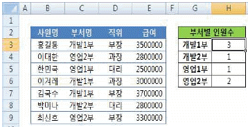 다음 중 아래 시트에서 부서별 인원수[H3:H6]를 구하기 위하여 [H3]셀에 입력되는 배열 수식으로 옳지 않은 것은?