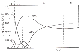 다음 그림은 폐기물을 매립한 후 발생하는 생성가스의 농도 변화를 단계적으로 나타낸 것이다. 유기물이 효소에 의해 발효되는 "혐기성 비메탄" 단계는?