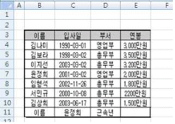 아래 시트에서 윤정희의 근속년을 2012년을 기준으로 구하고자 한다. 다음 중 [E11] 셀에 입력할 수식으로 옳은 것은?