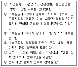 아래 글상자에서 경영전략 수립을 위한 환경분석 중 전략과제의 도출 순서가 옳게 나열된 것은?