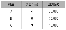 A, B, C 세 점포의 크기와 소비자의 집으로부터 각 점포까지의 거리는 아래와 같다. 이 경우 Huff 모델을 적용하였을 때 이 소비자가 구매확률이 가장 높은 점포 및 그 점포를 선택할 확률은? (가정 : 이 소비자는 A, B, C 세 점포들에서만 상품을 구매할 수 있음. 소비자가 부여하는 점포 크기에 대한 효용은 1, 거리에 대한 효용은 -2임.)