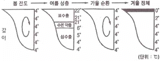 수심이 깊은 온대 지방의 호수는 계절에 따른 수온변화로 물의 밀도차이를 일으킨다.