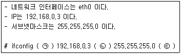 네트워크 구성 중 ifconfig 명령어를 이용해 네트워크 인터페이스에 IP를 할당하고 해당 인터페이스를 활성화 하려고 한다. 다음 중 ( 괄호 ) 안에 들어갈 내용으로 알맞은 것은?