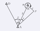 삼각점 A에 기계를 설치하였으나, 삼각점 B가 시준이 되지 않아 점 P를 관측하여 T′= 68° 32′ 15″를 얻었다. 보정각 T는? (단, S = 2km, e = 5m,