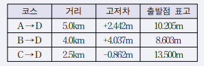 D점의 표고를 구하기 위하여 기지점 A, B, C에서 각각 수준측량을 실시하였다면, D점의 표고 최확값은?