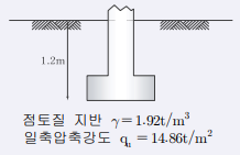 다음 그림과 같이 점토질 지반에 연속기초가 설치되 어 있다. Terzaghi 공식에 의한 이 기초의 허용지지력