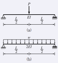 그림(a)와 (b)의 중앙점의 처짐이 같아지도록 그림(b)의 등분포하중 w를 그림 (a)의 하중 P의 함수로 나타내면?