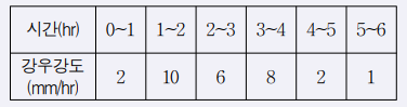 어떤 유역에 내린 호우사상의 시간적 분포가 표와 같고 유역의 출구에서 측정한 지표유출량이 15mm일 때 \phi -지표는?