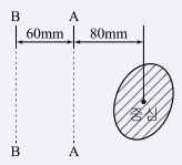 아래 그림에서 A-A축과 B-B축에 대한 음영 부분의 단면 2차 모멘트가 각각 8×10^8mm^4, 16×10^8mm^4일 때 음영 부분의 면적은?