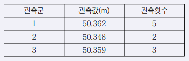 동일 구간에 대해 3개의 관측군으로 나누어 거리관측을 실시한 결과가 표와 같을 때, 이 구간의 최확값은?