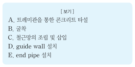 [보기]는 지하연속벽(slurry wall)공법의 시공내용이다. 그 순서를 옳게 나열한 것은?