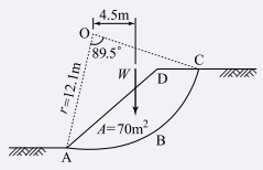 이다. 그림과 같은 파괴면에 대하여 사면의 안전율은? (단, ABCD의 면적은 70m²이고 O점에 ABCD의 무게중심까지의 수직거리는 4.5m이다.)