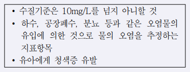 먹는 물의 수질기준 항목에서 다음 특성을 갖고 있는 수질기준항목은?