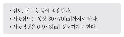 굴착토사와 안정액 및 공수 내의 혼합물을 드릴 파이프 내부를 통해 강제로 역순환시켜 지상으로 배출하는 공법으로 다음과 같은 특징이 있는 현장타설 콘크리트말뚝공법은?