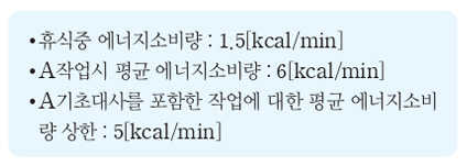A작업의 평균에너지소비량이 다음과 같을 때, 60분간의 총 작업시간 내에 포함되어야 하는 휴식시간(분)은?