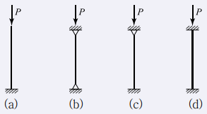 그림과 같은 기둥에서 좌굴하중의 비 (a) : (b) : (c) : (d)는? (단, EI와 기둥의 길이는 모두 같다.)