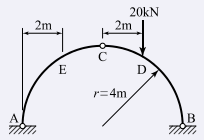 다음 그림과 같은 r=4m인 3힌지 원호 아치에서 지점 A에서 2m 떨어진 E점에 발생하는 휨모멘트의 크기는?