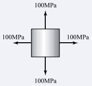그림과 같이 이축응력(二軸應力)을 받는 있는 요소의 체적변형률은? (단, 이 요소의 탄성계수