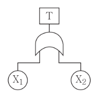 다음 FT도에서 시스템에 고장이 발생할 확률은 약 얼마인가? (단, X_1X_2의 발생확률은 각각 0.05, 0.03 이다.)