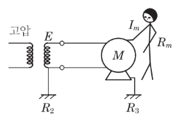 (단, E[V]는 전원의 대지전압, R_2[Ω]는 변압기 1선 접지, 제2종 접지저항, R_3[Ω]는 전기기기 외함 접지, 제3종 접지저항, R_m[Ω]는 인체저항이다.)
