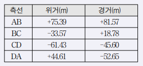트래버스 ABCD에서 각 측선에 대한 위거와 경거 값이 아래 표와 같을 때, 측선 BC의 배횡거는?