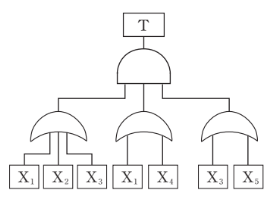 그림과 같이 FTA로 분석된 시스템에서 현재 모든 기본사상에 대한 부품이 고장난 상태이다. 부품 X_1부터 부품 X_5 까지 순서대로 복구한다면 어느 부품을 수리 완료하는 시점에서 시스템이 정상가동 되는가?