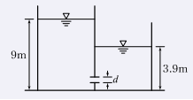 그림과 같이 일정한 수위가 유지되는 충분히 넓은 두 수조의 수중 오리피스에서 오리피스의 직경 d=20cm일 때, 유출량 Q는? (단, 유량계수 C=1 이다.)