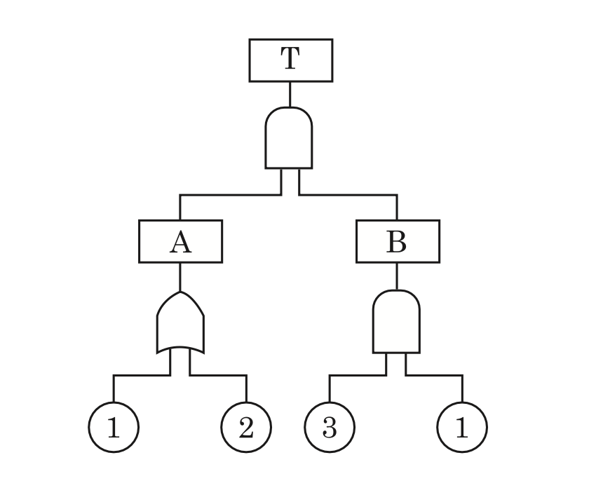그림과 같은 FT도에 대한 최소 컷셋(minimal cut sets)으로 옳은 것은?(단, Fussell의 알고리즘을 따른다.)