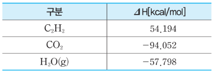 아세틸렌가스가 다음과 같은 반응식에 의하여 연소할 때 연소열은 약 몇 [kcal/mol]인가?(단, 다음의 열역학 표를 참조하여 계산한다.)