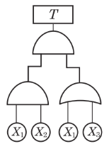 다음의 FT도에서 정상사상 T의 발생확률은 얼마인가?(단, X_1, X_2, X_3의 발생확률은 모두 0.1이다.)