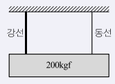 그림과 같이 강선과 동선으로 조립되어 있는 구조물에 200kg의 하중이 작용하면 강선에 발생하는 힘은? (단, 강선과 동선의 단면적은 같고, 강선의 탄성계수는