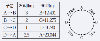 그림과 같은 수준환에서 직접수준측량에 의하여 표와 같은 결과를 얻었다. D점의 표고는? (단, A점의 표고는 20m, 경중률은 동일)