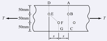 순단면이 볼트의 구멍 하나를 제외한 단면(즉, A-B-C 단면)과 같도록 피치(s)를 결정하면?(단, 구멍의 직경은 22mm이다.)