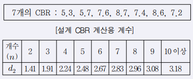 도로 연장 3km 건설 구간에서 7개 지점의 시료를 채취하여 다음과 같은 CBR을 구하였다. 이때의 설계 CBR은 얼마인가?