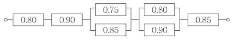 다음 그림과 같은 시스템의 신뢰도는 약 얼마인가?(단, 각각의 네모안의 수치는 각 공정의 신뢰도를 나타낸 것이다.)