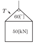그림과 같이 50[kN]의 중량물을 와이어 로프를 이용하여 상부에 60[°]의 각도가 되도록 들어올릴 때, 로프 하나에 걸리는 하중(T)은 약 몇 [kN]인가?