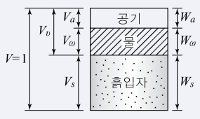 아래 그림과 같은 흙의 구성도에서 체적 V를 1로 했을 때의 간극의 체적은? (단, 간극률은 n, 함수비는 w, 흙입자의 비중은